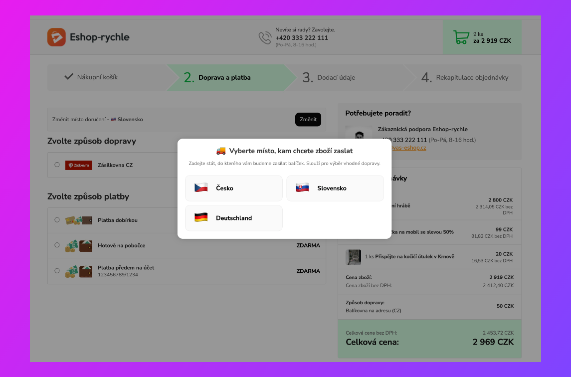 Zákazník v košíku uvidí box s ponukou štátov, z ktorých si vyberie. Hneď ako zákazník vyberie štát, košík okamžite zobrazí len relevantné dopravy a ostatné skryje. Svoju voľbu môže zákazník tlačidlom kedykoľvek zmeniť.