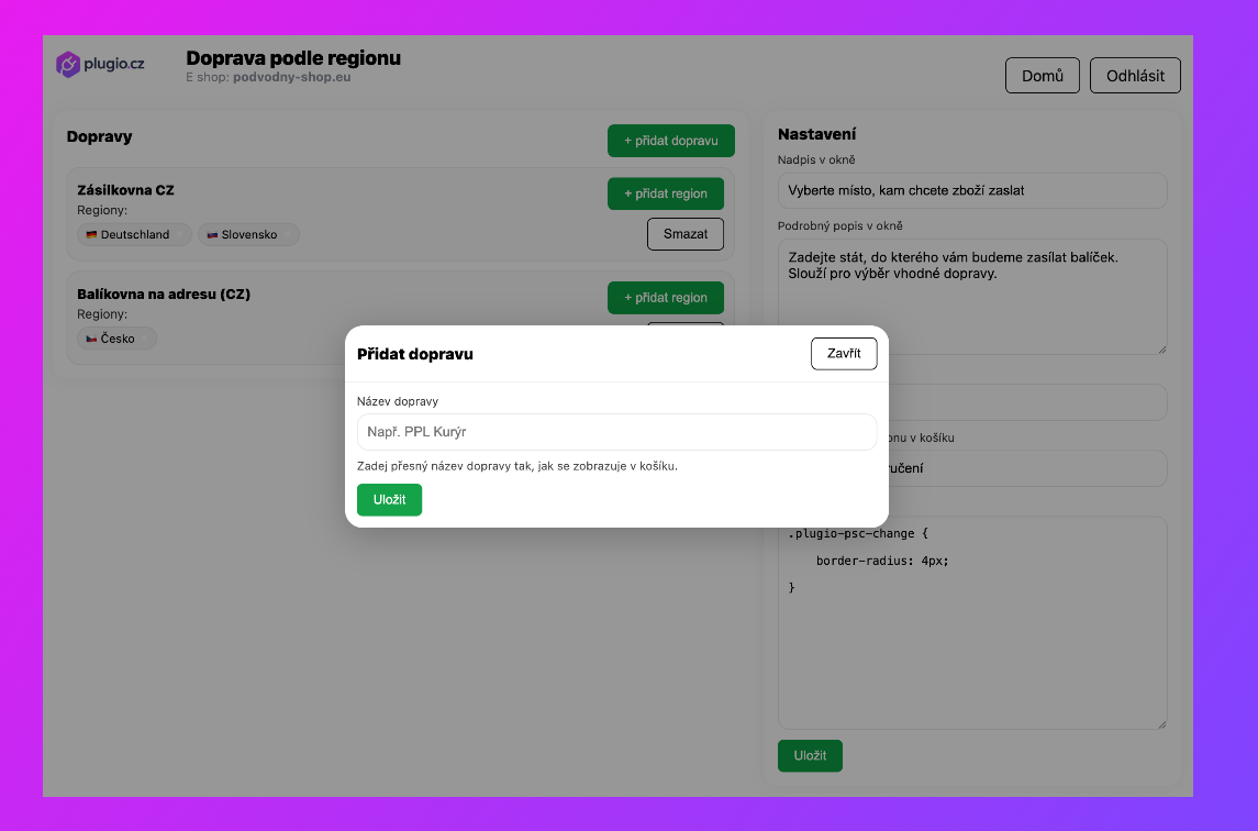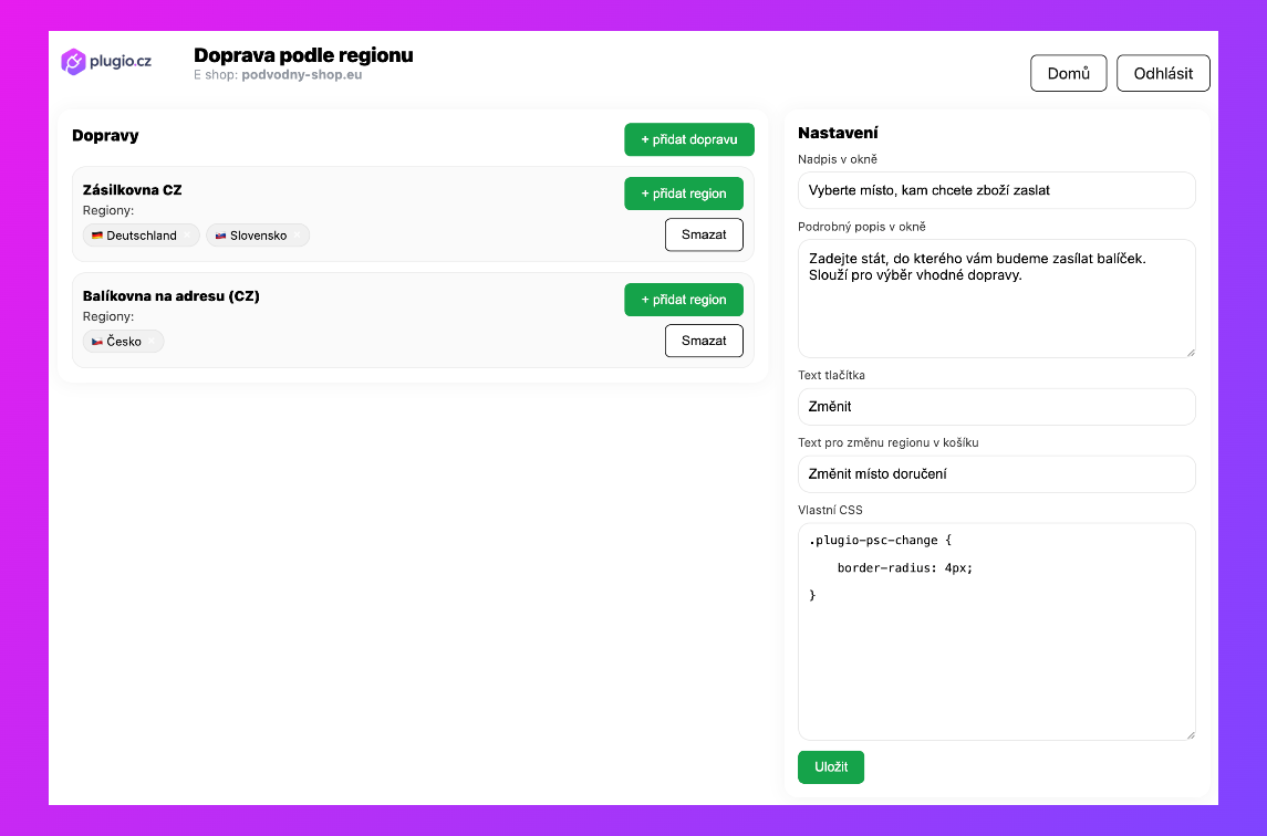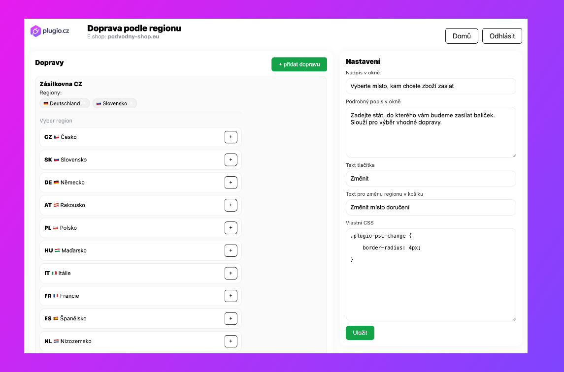 V administrácii na plugio.cz nastavíš texty a priradenie dopravných metód k štátom.